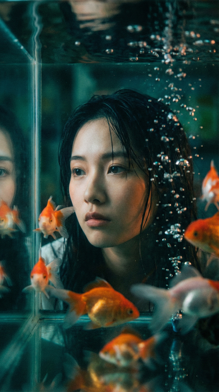 Submerge your portraits into a captivating underwater fantasy! This filter transforms your photos into a cinematic, high-resolution scene within a glass aqyarium, featuring glistening wet subjects, mesmerizing reflections, and vibrant orange goldfish. Create a cool-toned, moody masterpiece, brimming with aqyatic wonder and serene depth.